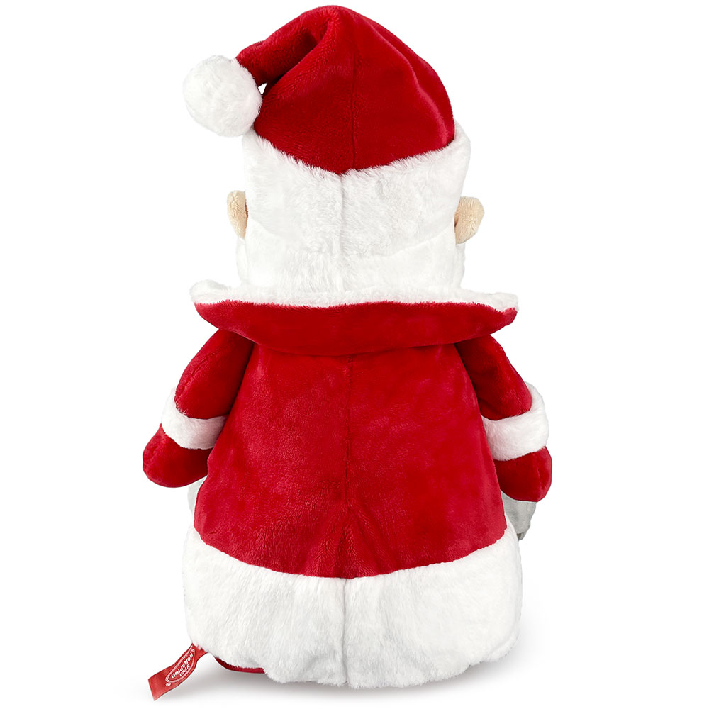 Широко улыбающийся Дедушка Мороз с густой бородой, в классическом костюме с отделкой из белоснежного меха — красный кафтан с воротником, шапочка с помпоном, варежки и валенки. Глаза и улыбка сделаны вышивкой.